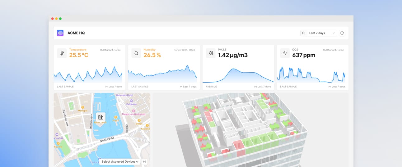 Customizable visualizations: Display measurement values using various color gradients, across different data layers (rooms, desks, and floors)